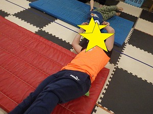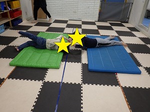 マットの感触や弾力性がわかる遊びです。大きなぞうきんのイメージで行ってみましょう。
