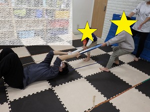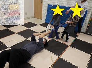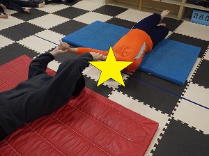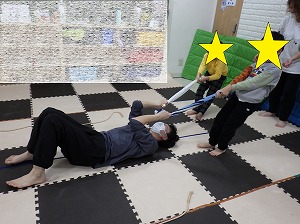 ペアで向かい合って手をつなぎ、交互に引っ張り合いましょう(*^▽^*)
