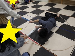 タオルの釣り糸で先生魚を釣り上げます。