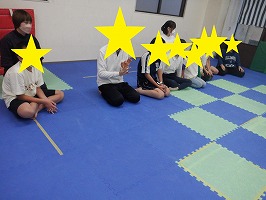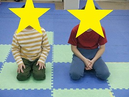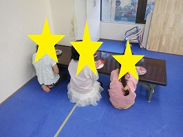 『お・か・し・も』のお約束の確認と、頭を守る体勢のダンゴ虫さんのポーズを行い、