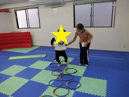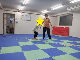 フープひとつは両足でグー、ふたつは片足ずつでパー。