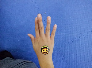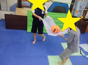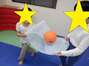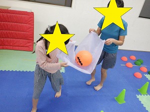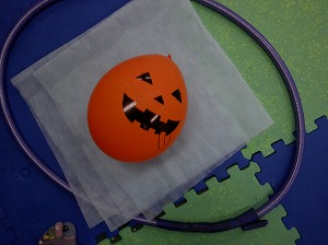 カボチャを不織布の布に乗せて平均台を渡ります。