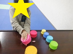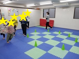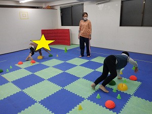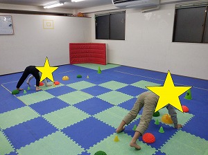 鬼さんが後ろを向いている間にボールを拾ってボールと同じ色のマーカーコーンに置きます。マーカーコーンにボールが乗っている場合は、ボールを箱の中に入れます。鬼さんが合図と共に振り返った時には、動かずにピタリと止まります。クマさんか犬さんで行いました。
