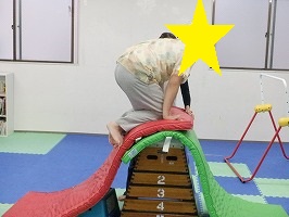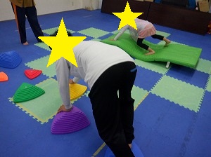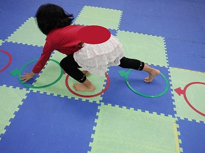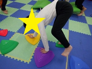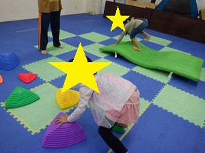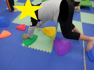 クマさんに変身して、でこぼこ石渡りとでこぼこマットを渡ります。