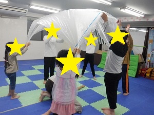 大きなビニールにボールを乗せて、ボールのトランポリン☆彡