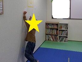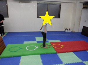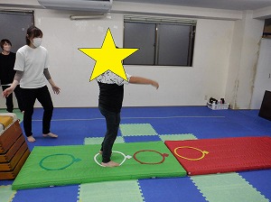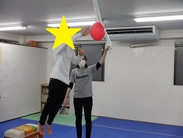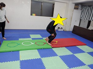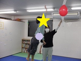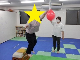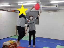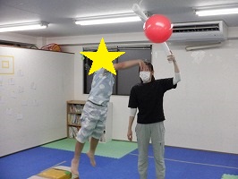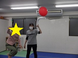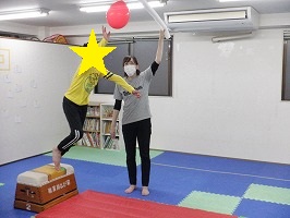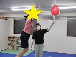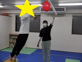 高い所からジャンプして風船にタッチをしましょう。風船をタッチしてから着地することが出来たかな?