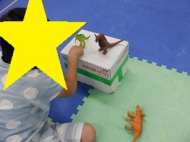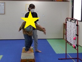 跳び箱に乗って高い所からボールを的に向かって投げます。いつもよりも目線が高くなったね☆彡落ちないように気をつけながら、狙った数字にボールを当てることができたかな?