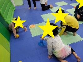 仰向けの状態になり、手足で支えて腰を浮かせます。クモさんに変身したら、みんなでメロンパンを運んでリレーします☆彡おなかに乗せたメロンパンを落とさずに運べるかな?腕の力だけでなく全身を意識した運動遊びです。
