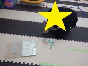 様々な色のカップに、同じ色のボールをペンギン歩きで一つずつ運んでいきます。