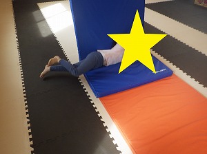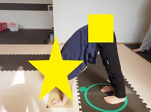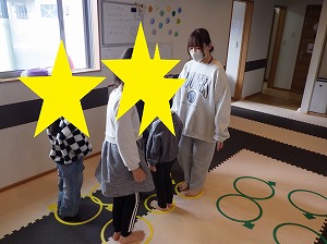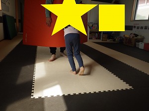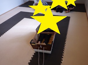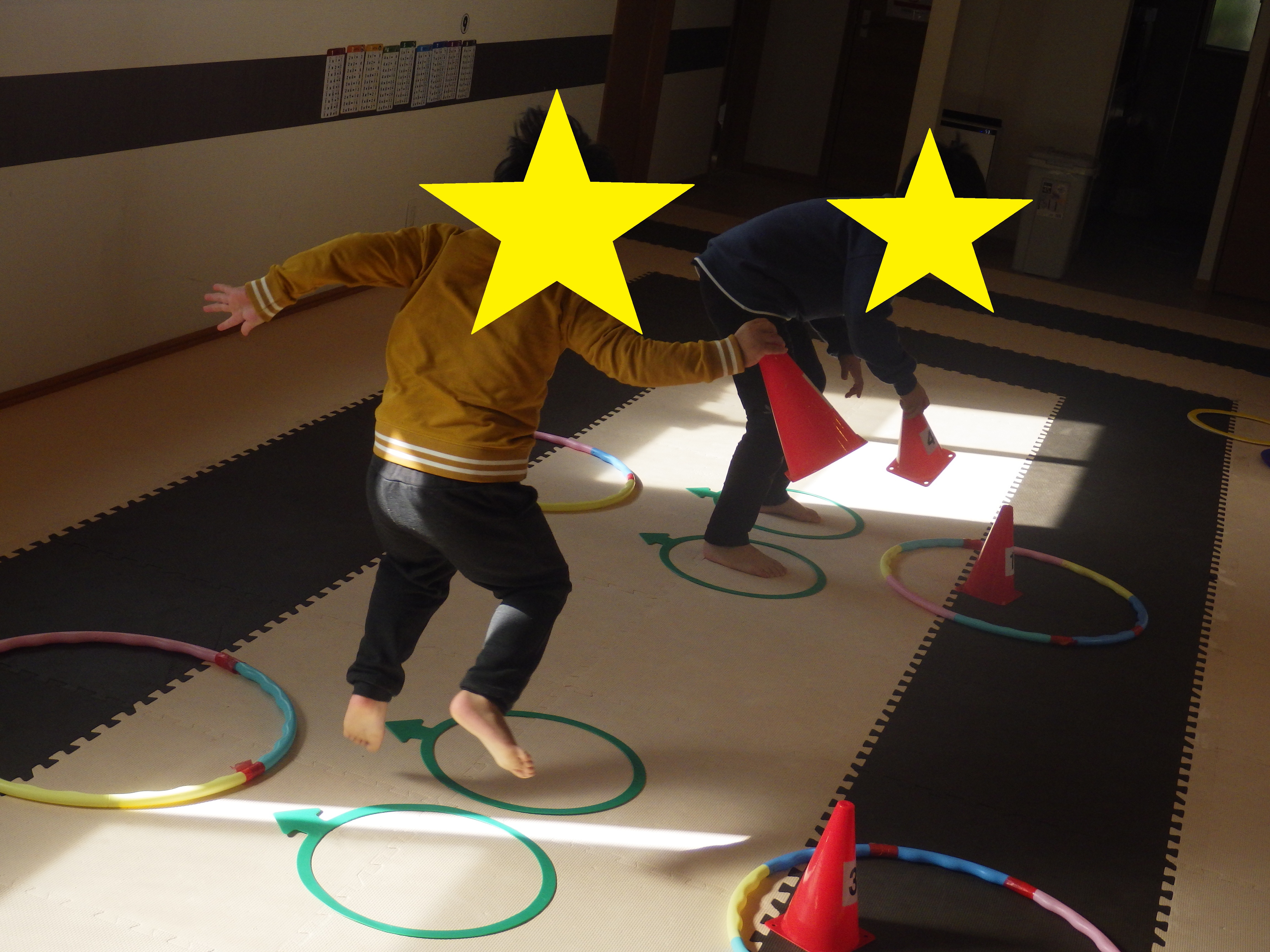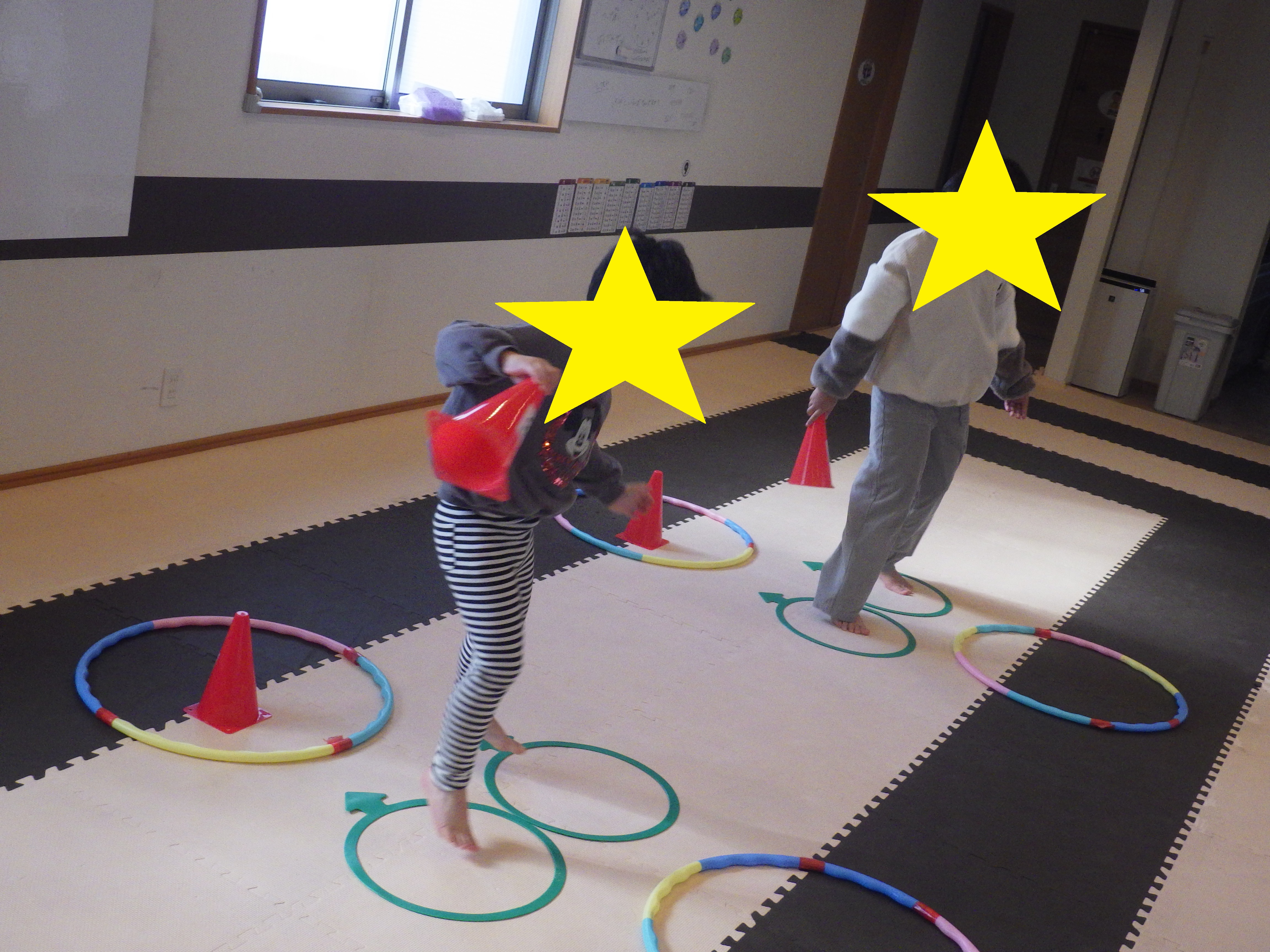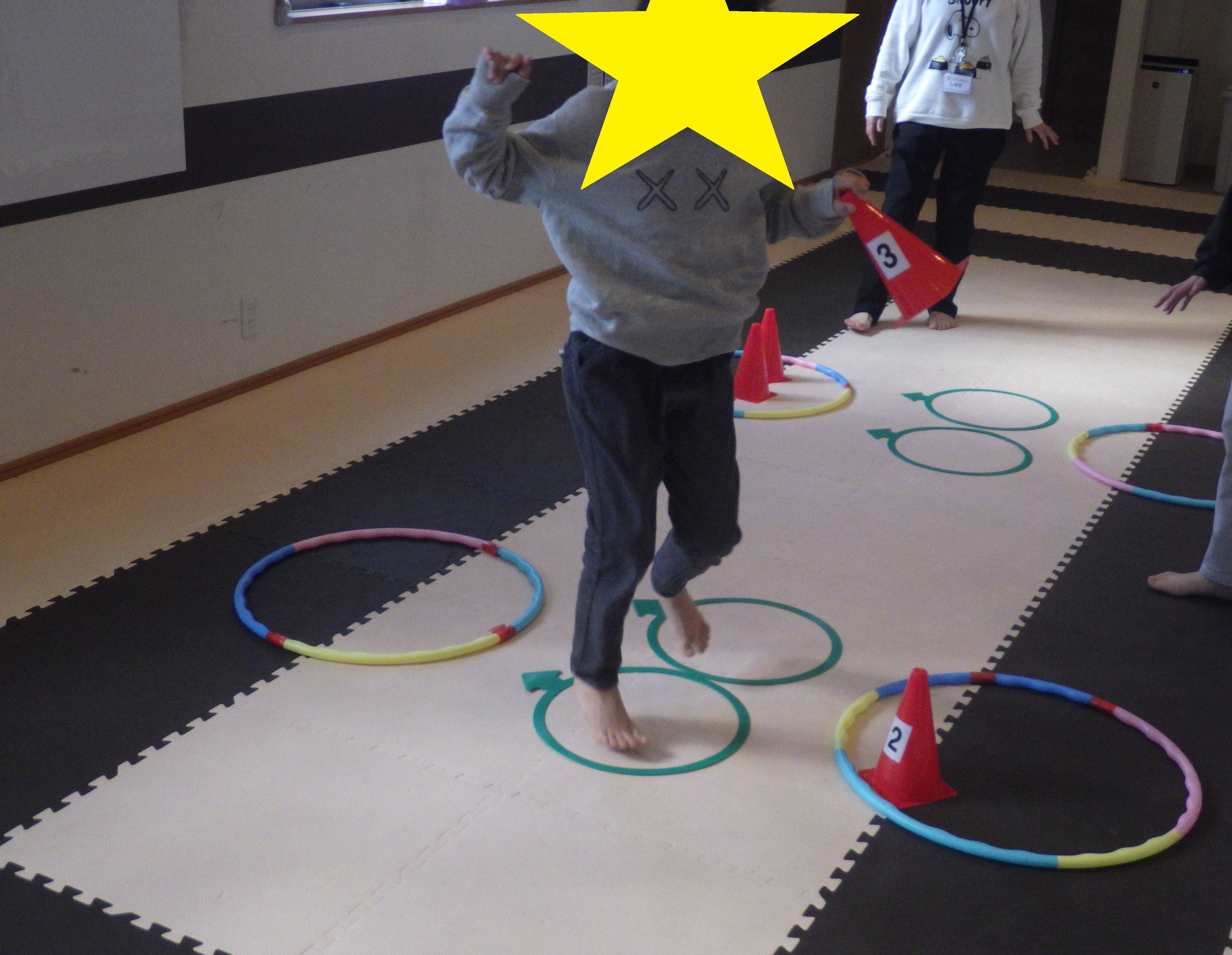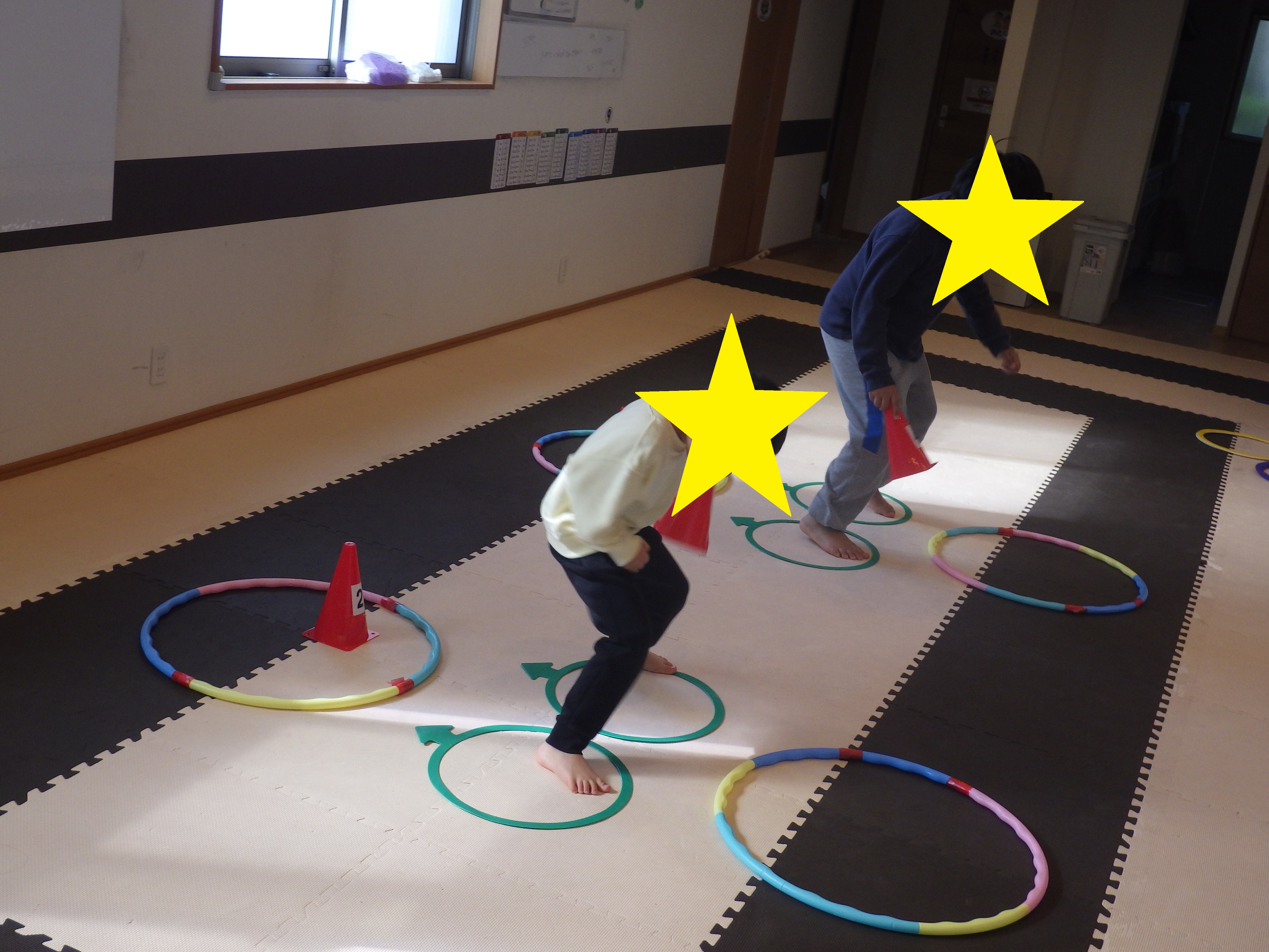フープを4つと配達するものを用意して、両足でジャンプしてくるんと回って隣のおうちにお届けいたします!
