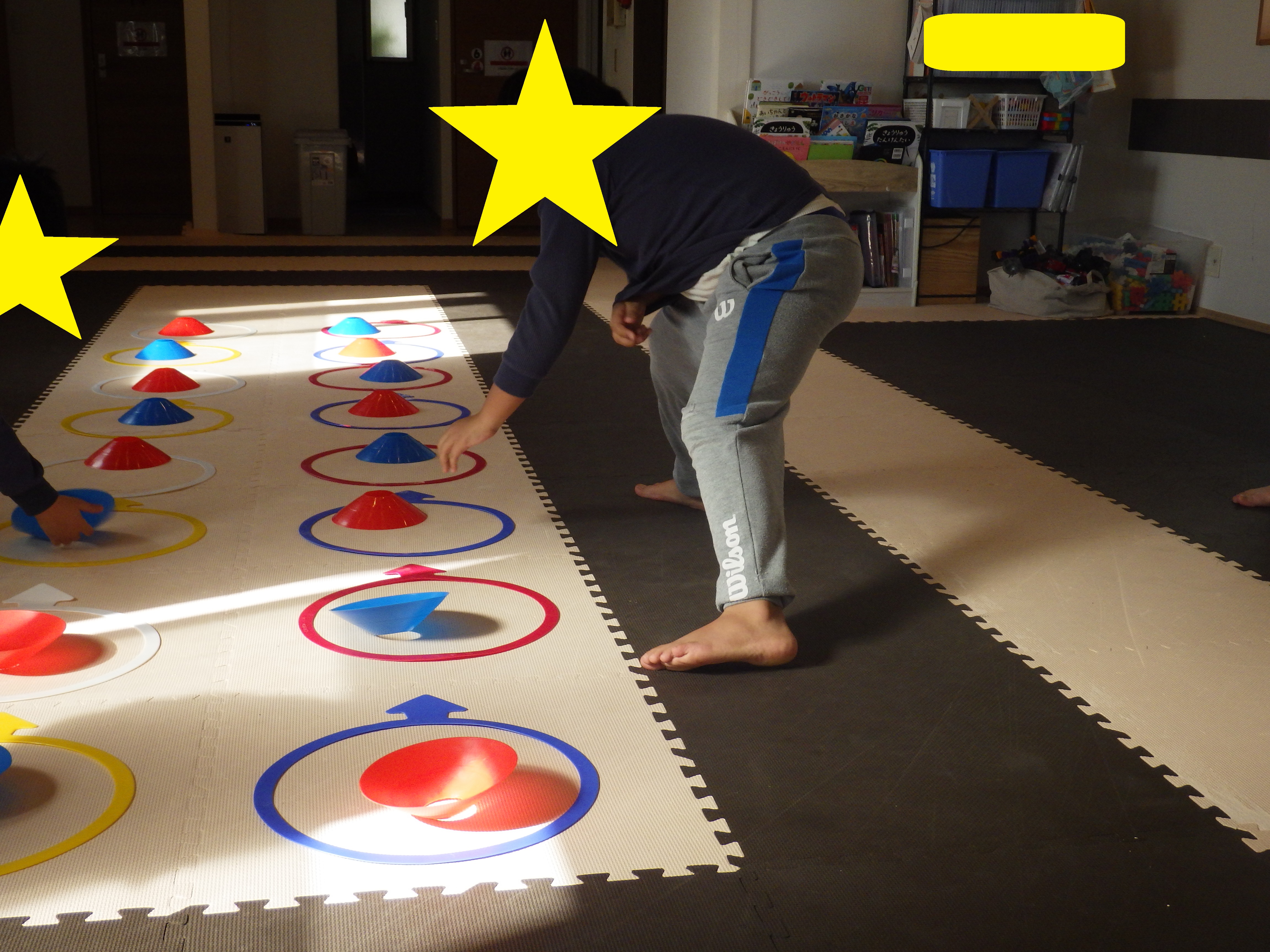 クルクル歩いて回って『キャッチ!』と言われたらコーンを取りましょう!
