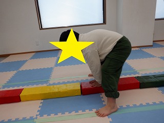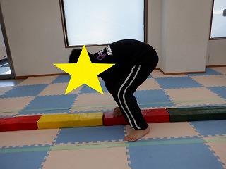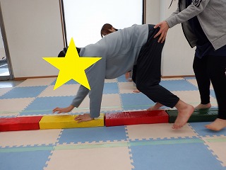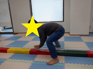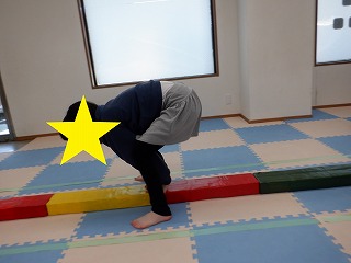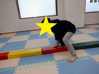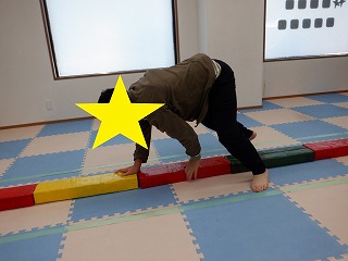平均台の上に手を置いて、手・足・手・足のリズムで進みます❣