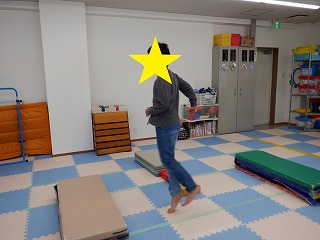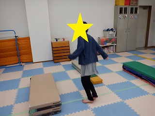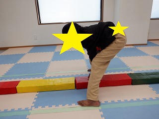 真ん中に縦に並べられた平均台を倒さないように気を付けながら、左右にジグザグに置かれたフープの中をジャンプしていきます!!