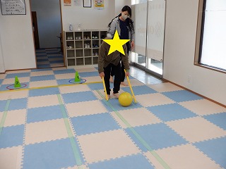 荷台に車輪の付いたスクーターに乗ってコーンの回りをくねくね移動しながら、お荷物をゴールまで運んでいきます!!