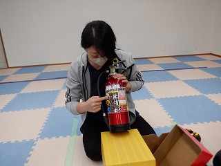 消防署に行く前に消火器の使い方を学び、防災頭巾を被る練習もしました❣
