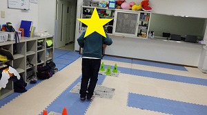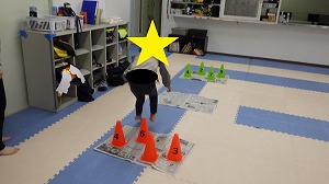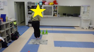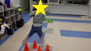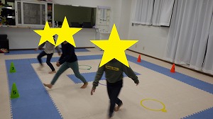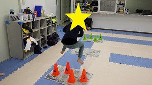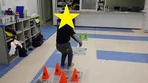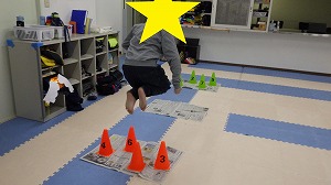 指示された三角コーンに向かって走り、タッチして戻ります。