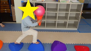 逆さまのコーンの上にボールを載せて持ちながら、落ちないようにでこぼこの上を渡っていきます!!