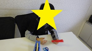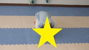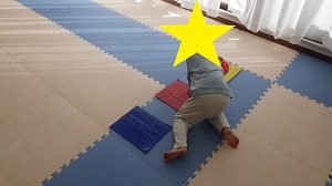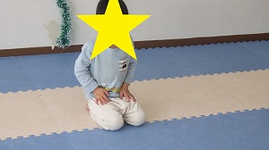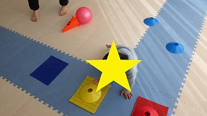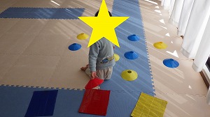 膝をついてペンギンさん歩きをしながら、正解の色のカップをそれぞれの紙の板の上に置くことが出来ました(*^^*)