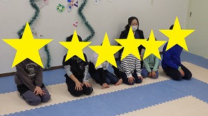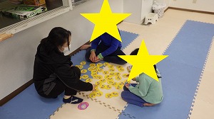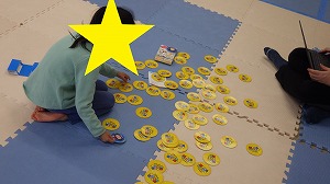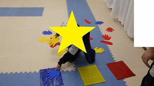 みんなお話を良く聞きながら、正解の色の手形と足形を同じ色の紙の板に置くことができました(^^)/