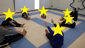 怪我をしないように柔軟体操で体を伸ばしましょう!