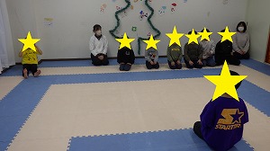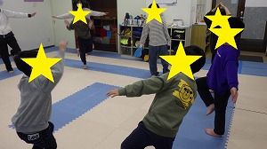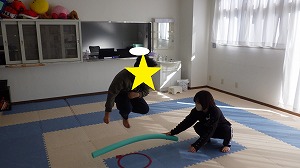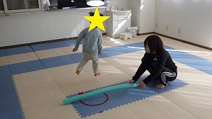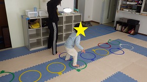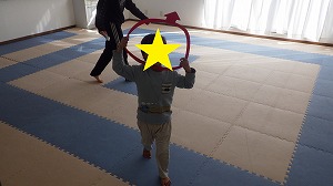 フープが1つの所はフープの中でしゃがんで小さくなって「グー」、フープが2つの所はバンザイをするように手足を大きく広げて「パー」!リズムよく出来るように頑張ろう!