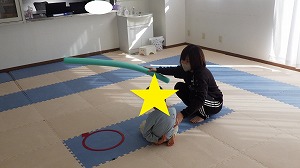スポンジ棒が足元に来たらジャンプで避けて、頭の上に来たら素早くしゃがみましょう!