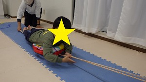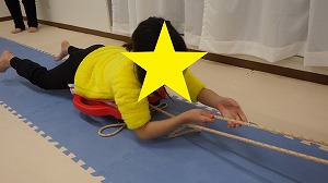 車輪の付いたスクーターに乗り、縄を手繰り寄せようにして掴み、前に進みます。ゴールに着いたらハイタッチ!