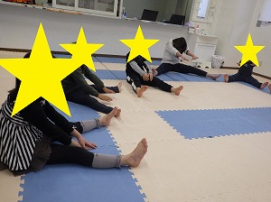 怪我をしないように柔軟体操で体を伸ばしましょう!