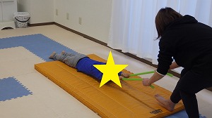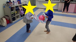 2人組になって毛布を持って、ボールをトランポリンのように弾ませながら1周します。