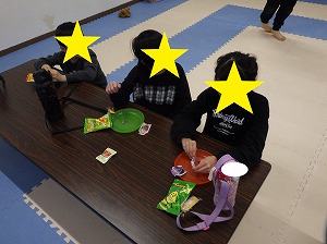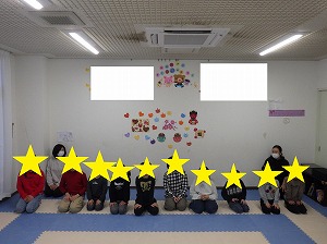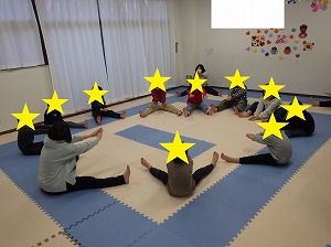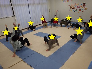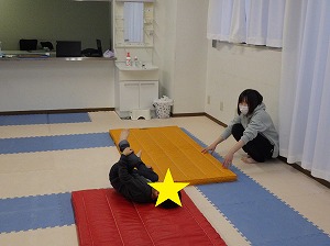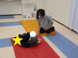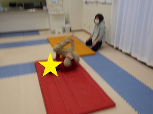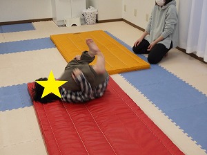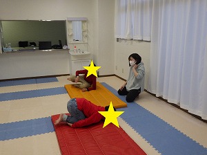 クモさんの旗揚げは、まずはお山座りから両手をお尻の横に付いてお尻を浮かせてクモさんのポーズ!職員が「右手」「左足」など言うので、言われた体の場所を浮かせます!