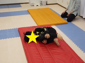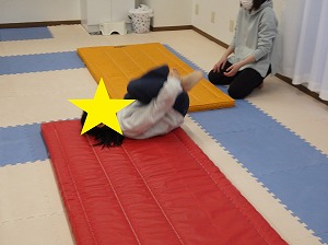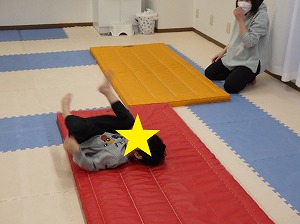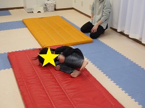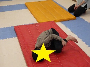 じゃがいもは、お山座りをするように両手で足を抱えたまま転がりましょう。途中でマットの道が変わるので落ちないように気をつけてゴールを目指して転がります。