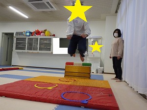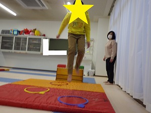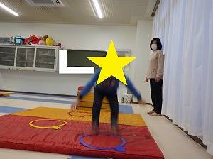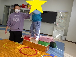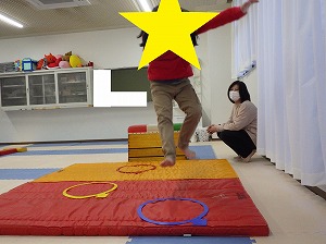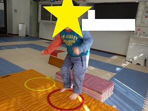指示された色のフープに向かって、跳び箱からジャンプしましょう!
