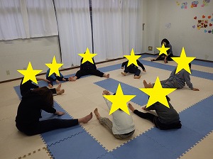 怪我をしないように柔軟体操で体を伸ばしましょう!
