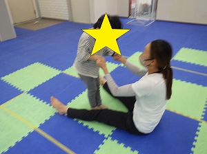 先生の足を跨いでパー。