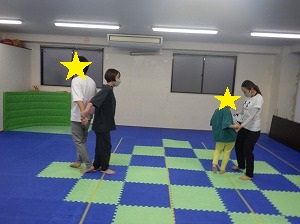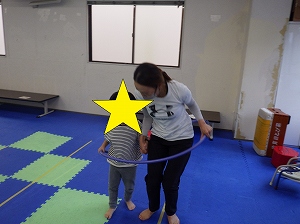 お買い物をしたら、先生と一緒にフープに入って下から上に持ち上げます。
