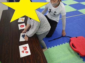 どこに風船を挟んで風船を運ぶか二人で相談し、出発です☆彡