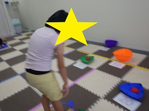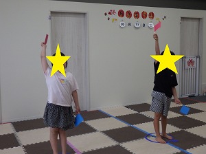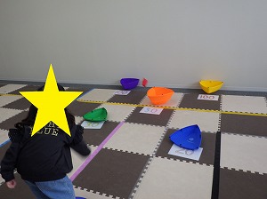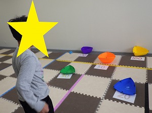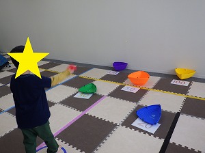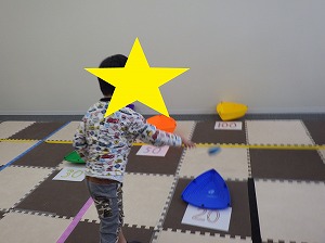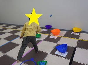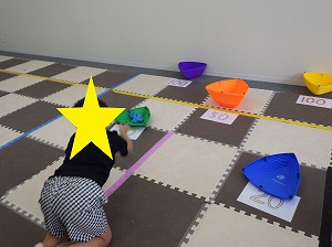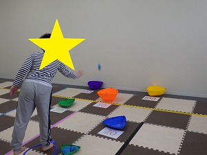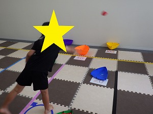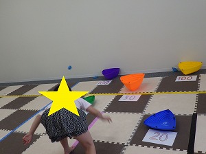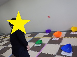 点数が書かれたケースにお手玉を投げ入れて遊びました。高得点を目指して頑張っていました。300点の高得点者も出現!!みんな、上手に投げることができました☆