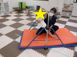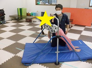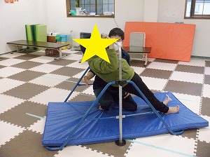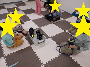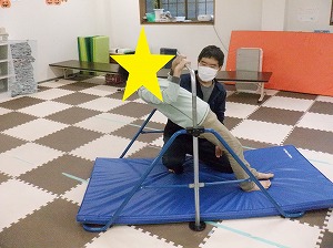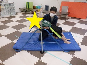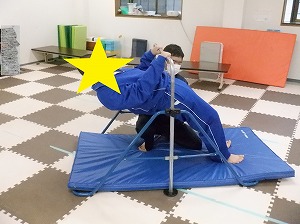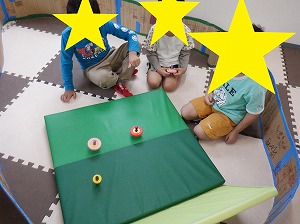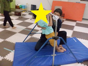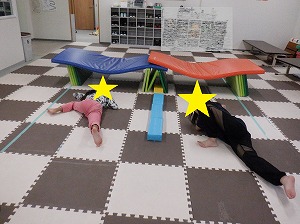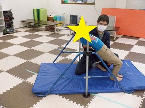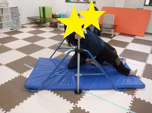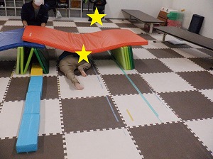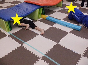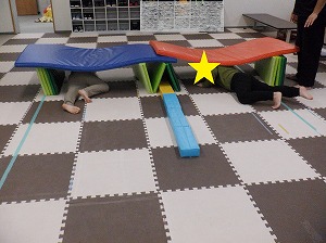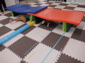 ワニ歩きでマットのトンネルを進みます。トンネルは倒れやすくなっているのでぶつからないように注意しながらくぐりましょう。