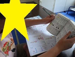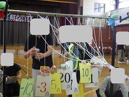 2人一組になって好きな紐を1本だけ引きます。引いたお宝はもらい、お宝についているポイントがチームの得点になります。加点だけでなく減点もあるので、中には減点をひいてしまったお友だちもいました~(+_+)