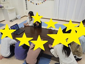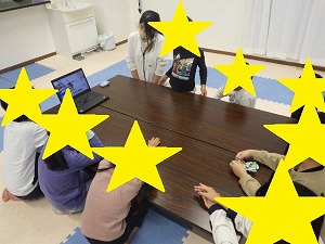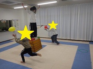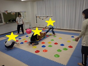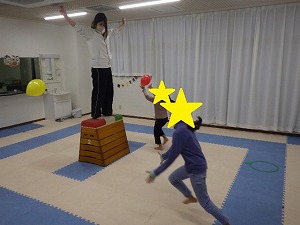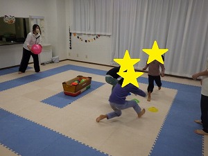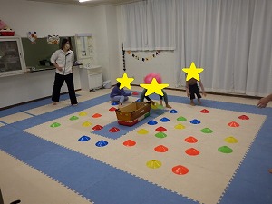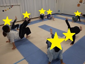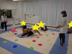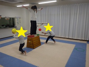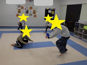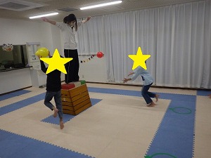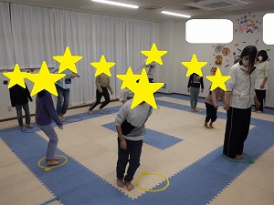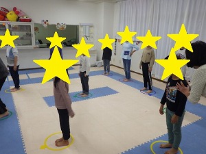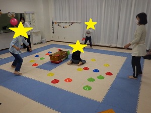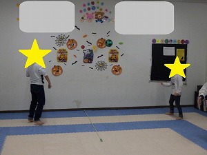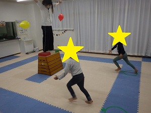 先生の真似をして「前、左右、後ろ」の方向にジャンプします。
