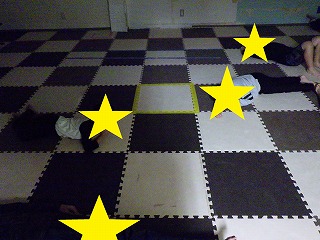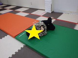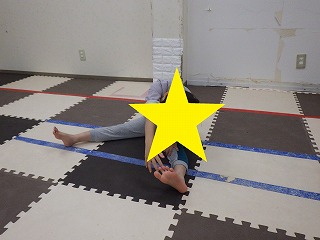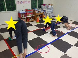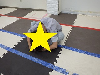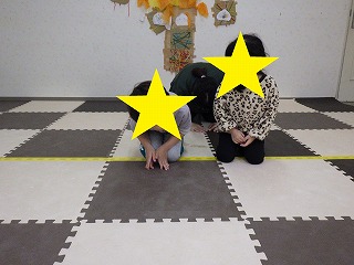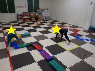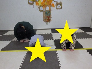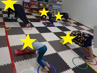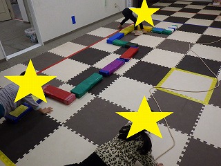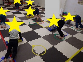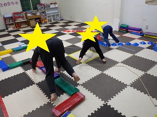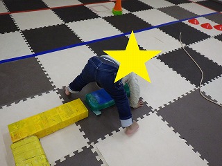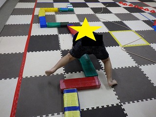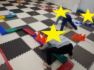 障害物にお腹が触れないようにクマさんの姿勢で迷路を進みましょう。