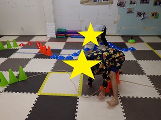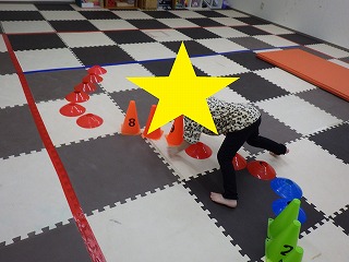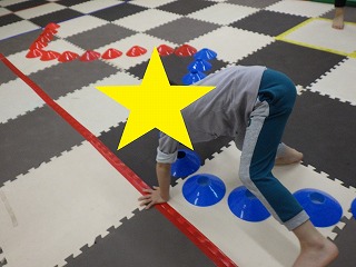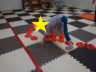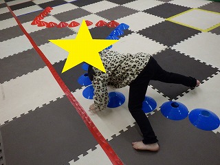 クマさんの姿勢でジグザグのマーカーコーンを渡っていきます。