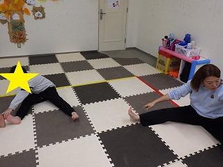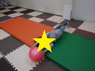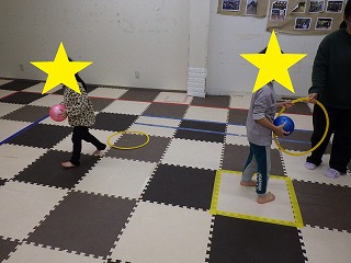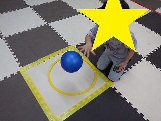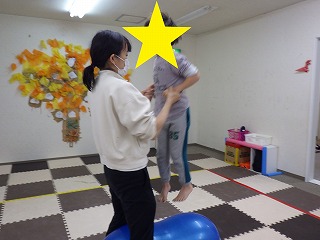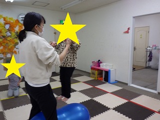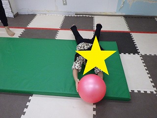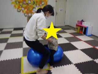 先生の手を持ってバランスボールをもってジャンプしましょう。