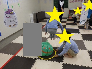 フープの中にかぼちゃを落として、それからかぼちゃの上をジャンプします。