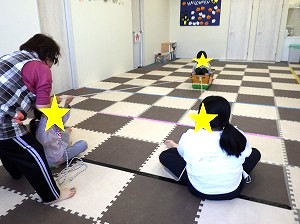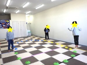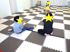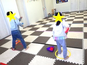 お手玉を使います。床を滑らせるようにして、お手玉を投げます。止まったところが点数になります。4回投げた合計を足します。高得点を目指してね♪