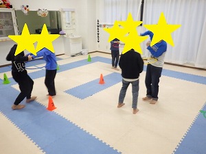今日は鬼役の人にじゃんけんで勝った人が、違うフープに移動する約束をしました!