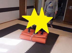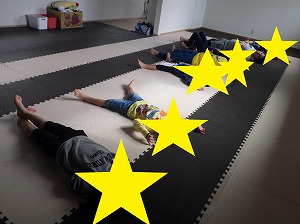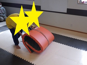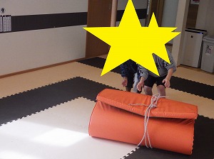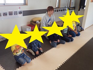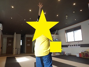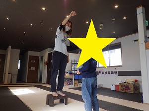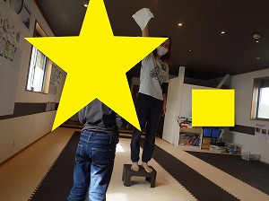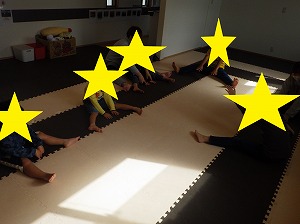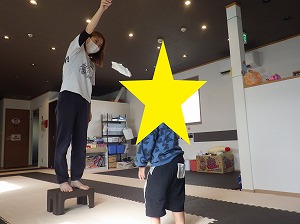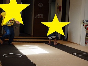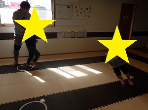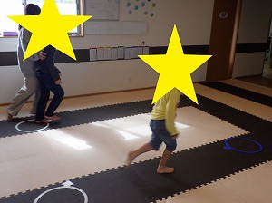 青と赤のフープに指導員の指示に合わせてダッシュします。