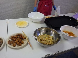 唐揚げやハンバーグにポテト、チキンライスやチャーハンなどたくさん用意しました。