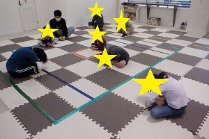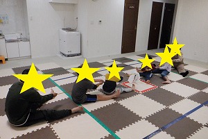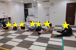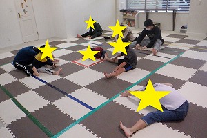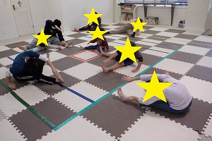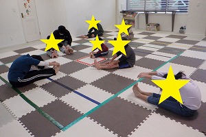 柔軟は、みんなで数をかぞえながら足先にタッチしましょう!