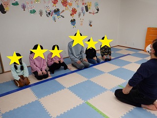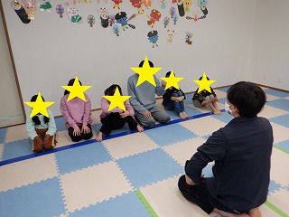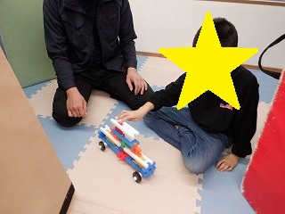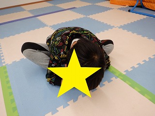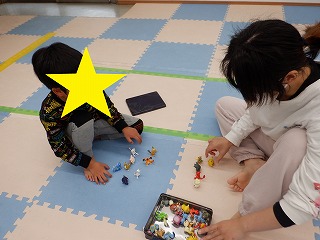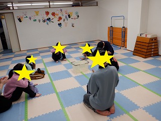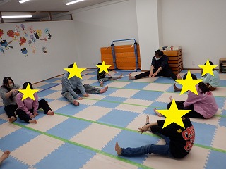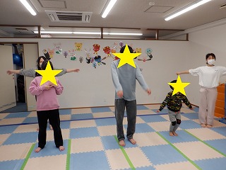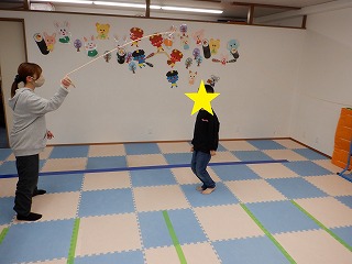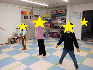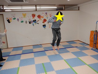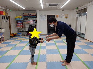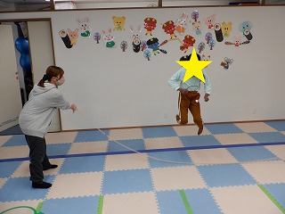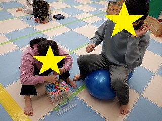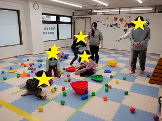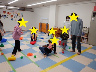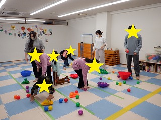 職員が「だるまさんが…」と言っている間に、ボールの色と入れ物の色をマッチングさせましょう!職員が振り返った時は、ピタッと動きを止めることができていましたね(^▽^)/